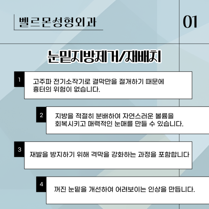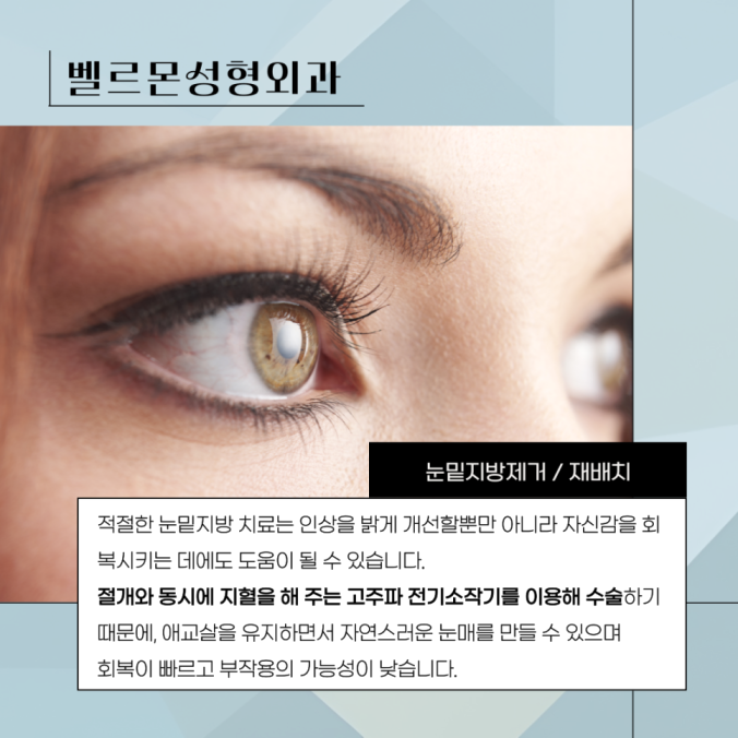 이런 고민을 가지고 계신 분들께 추천드리는 눈 성형이 바로 제주 눈밑지방제거/재배치입니다! 어둡고 볼록한 눈 밑을 환하게 만들어 활기차고 밝은 인상을 연출할 수 있지요.