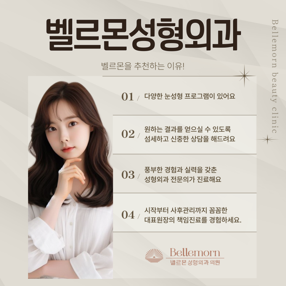 저희 벨르몬성형외과에서는 결막을 미세하게 절개하는 방식으로 수술을 진행하여, 높은 만족도를 얻고 있으며 볼록한 눈 밑을 효과적으로 해결할 수 있습니다.